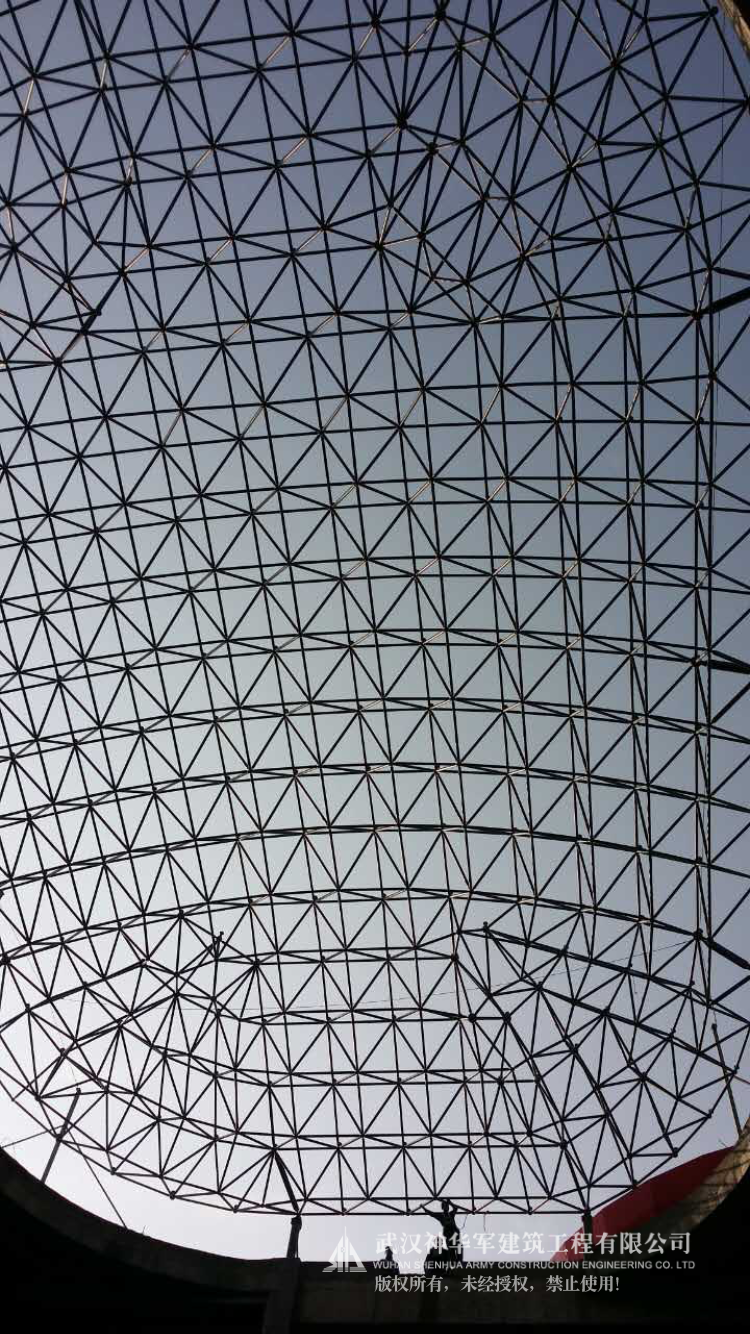 工程名称:湖北省黄梅县文化中心-博物馆采光顶建设单位:湖北省黄梅县文化局建设地点:湖北省黄梅文化中心博物馆结构形式: 正方四角锥螺栓球网架,上弦支撑。网架投影面积:518㎡柱顶标高:24.5m最大跨度:17.8m最大弦高: 2.5m(结构调坡)幕墙玻璃采用8+1.52+8夹胶双钢玻璃,展开面积:708㎡