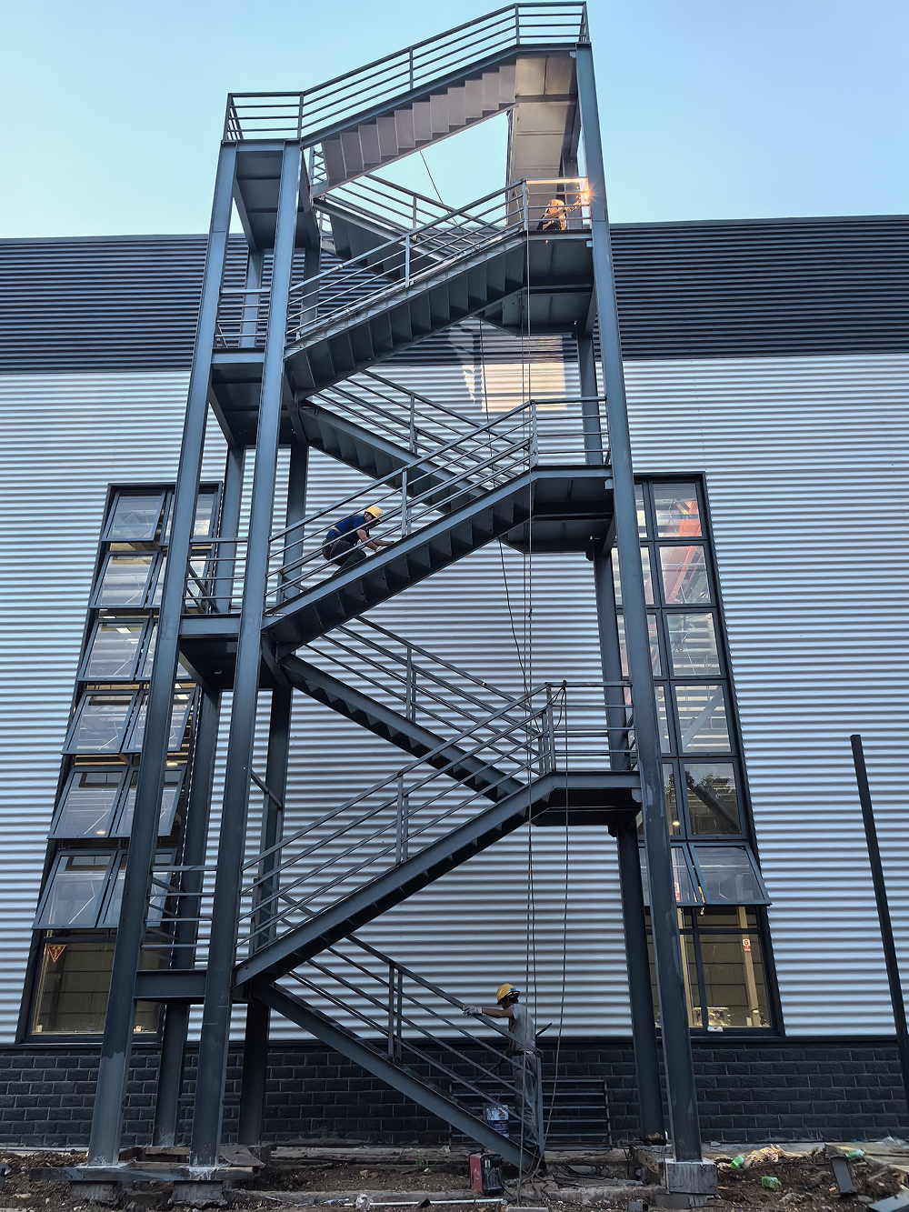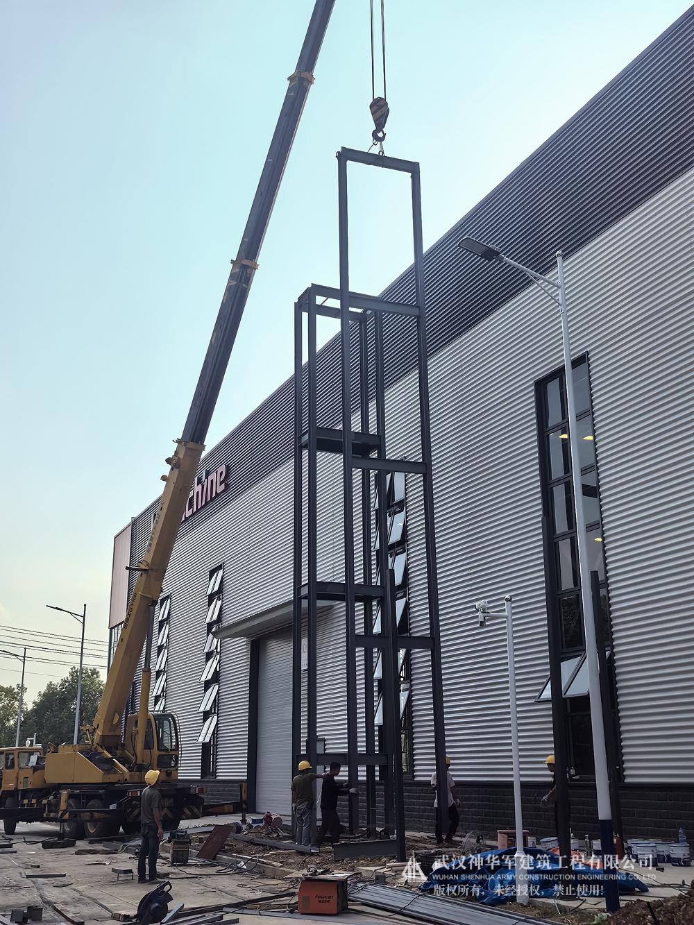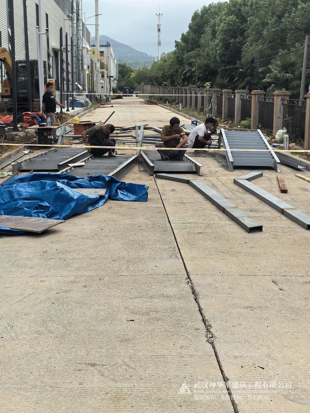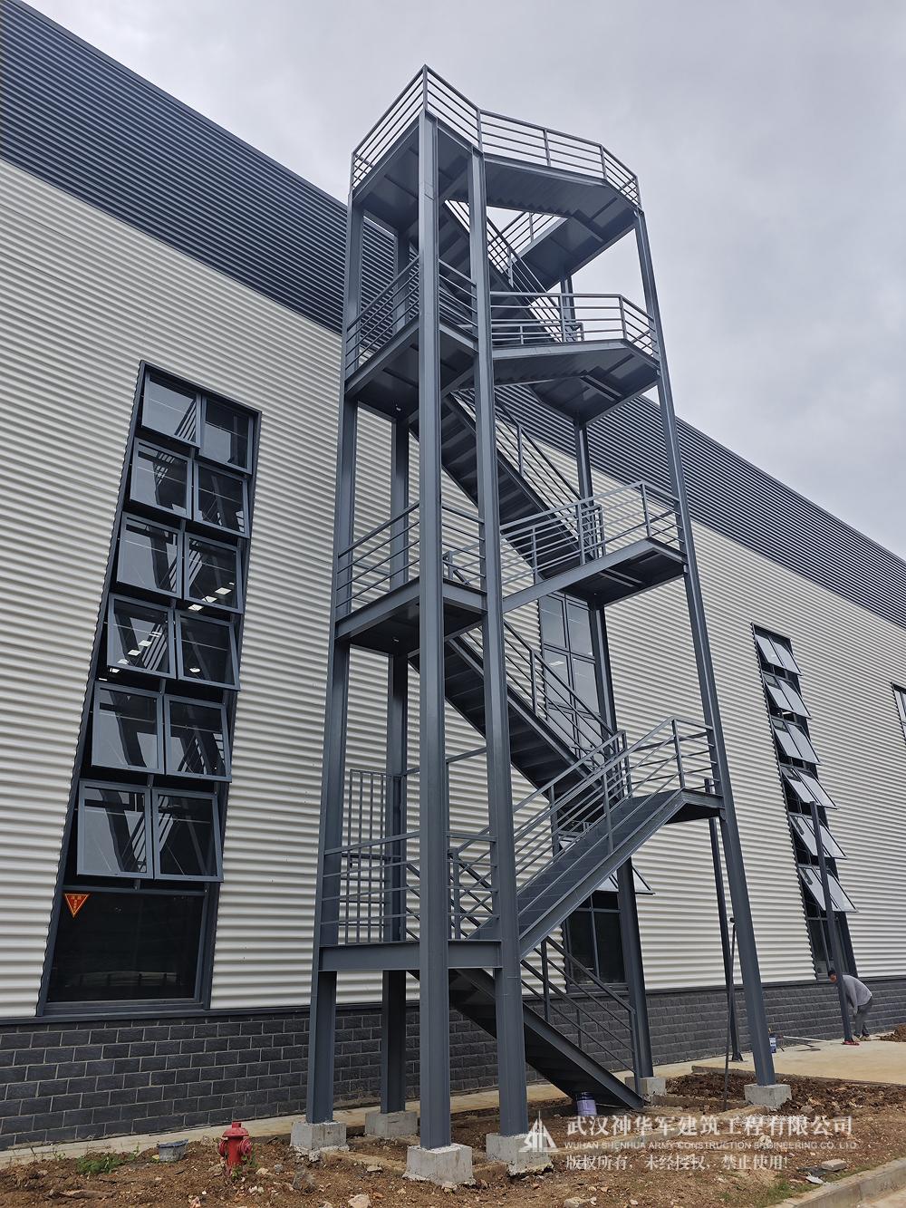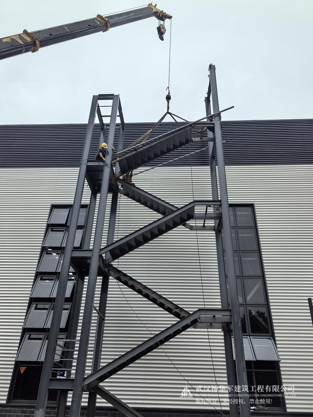 施工单位:武汉神华军建筑工程有限公司。楼梯为直跑钢楼梯,高度达到15.5m。直达5.4MW分布式光伏屋面。公司从设计到土建基础及钢结构制作安装,得到业主单位一致好评和认可。